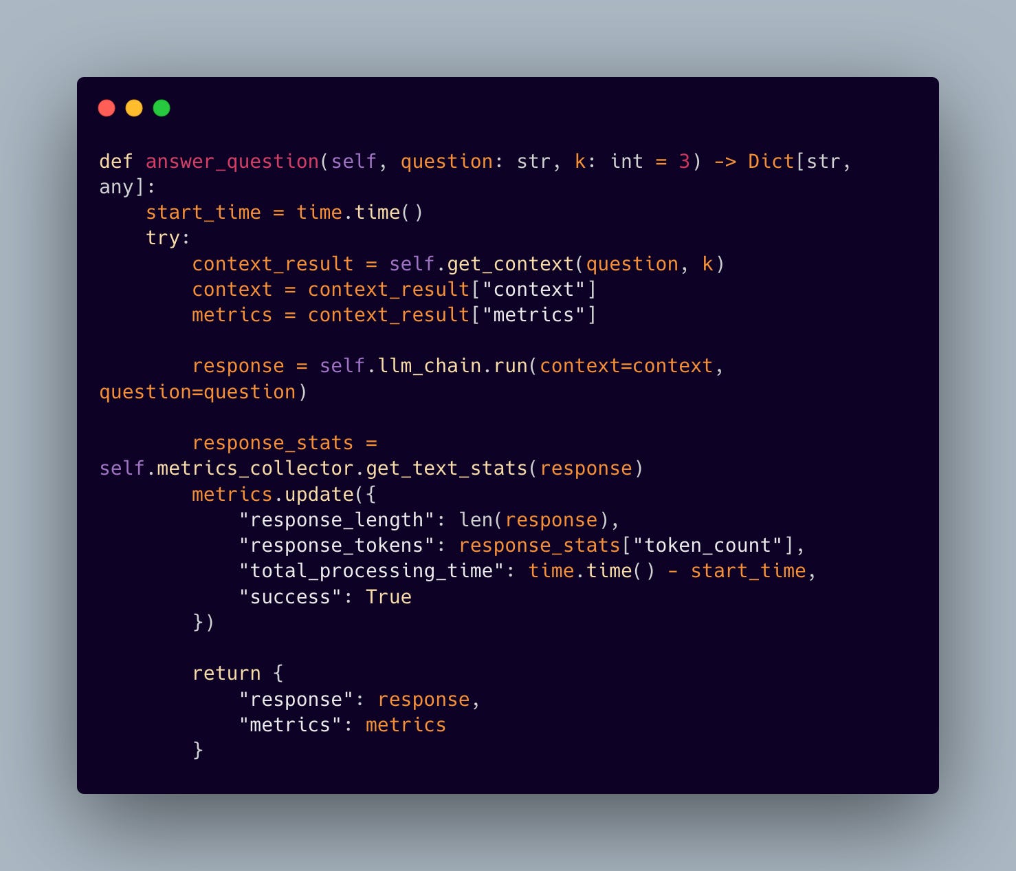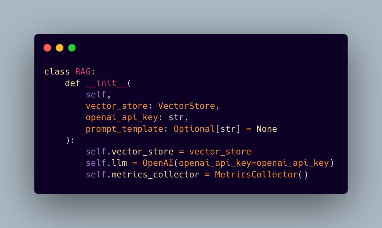 The initialization process sets up the key components and gets comprehensive metrics tracking in place—a must-have for production deployments. This setup gives us tight control over both the retrieval and generation phases while gathering important telemetry data.
