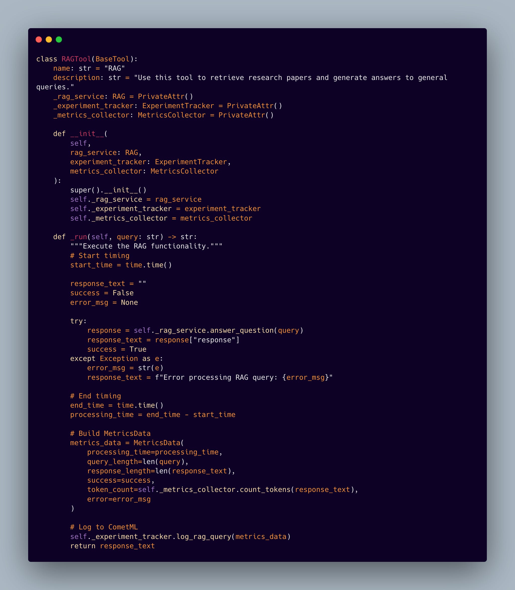 Our implementation truly shines is in how we leverage CometML Opik’s experiment tracking capabilities. We’ve built an ExperimentTracker that doesn’t just collect data — it weaves a narrative about our system’s performance: