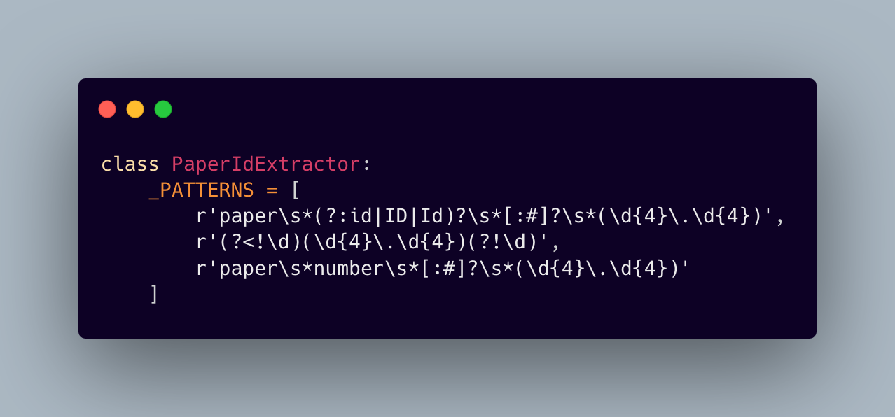 This pattern-matching approach allows our system to handle various formats and styles of paper ID references, making it more resilient to different query patterns.