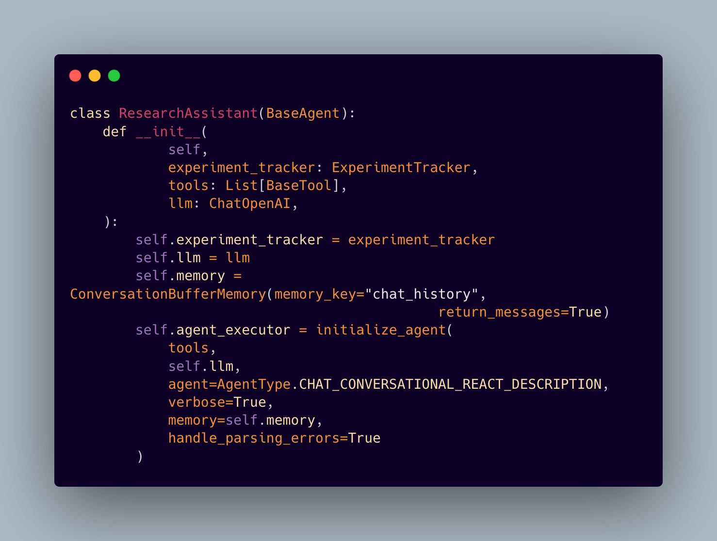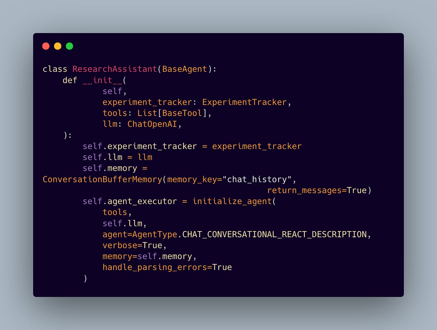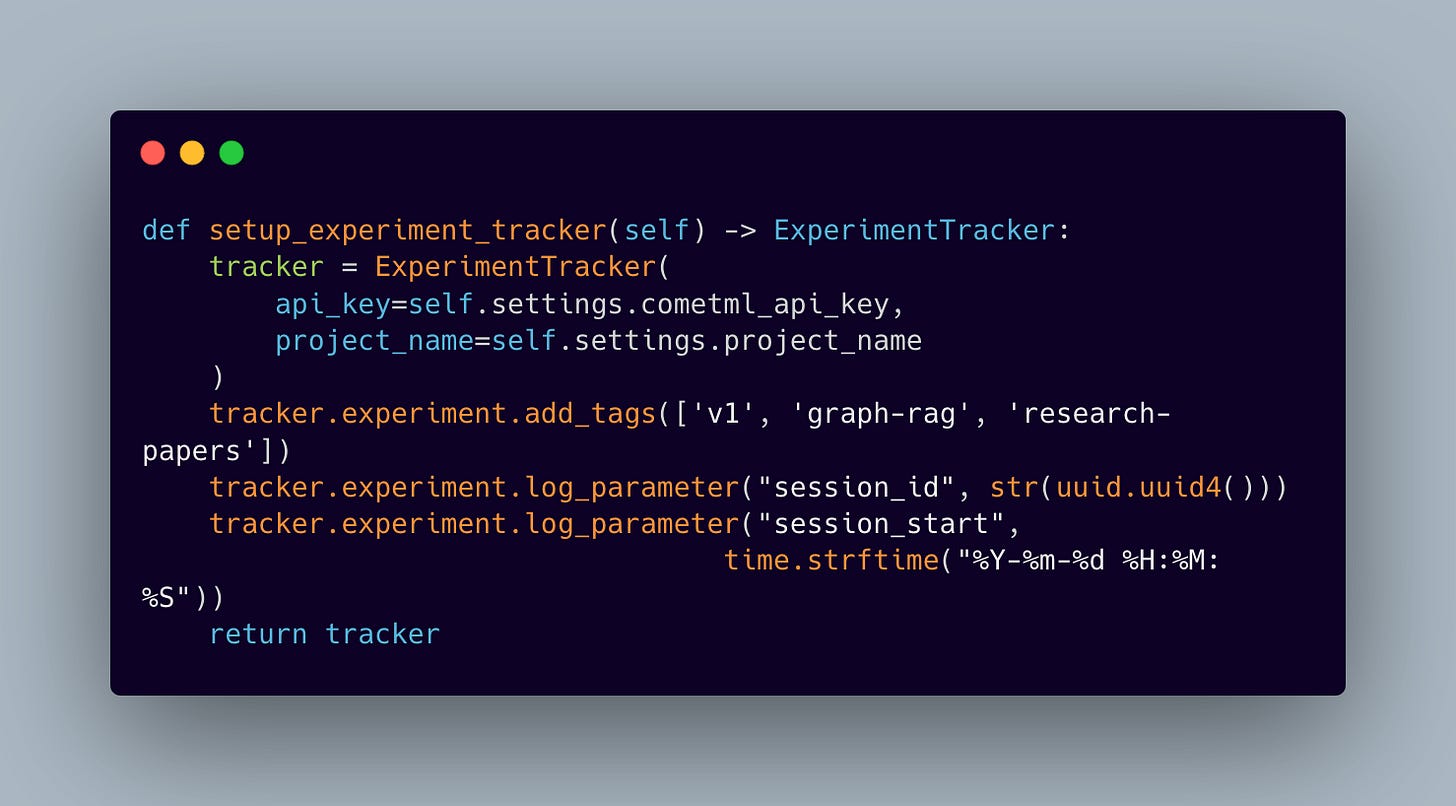 Every setup step has a purpose, making sure everything is ready to go when needed. For example, the experiment tracker gets set up first so it can start capturing metrics right from the start: