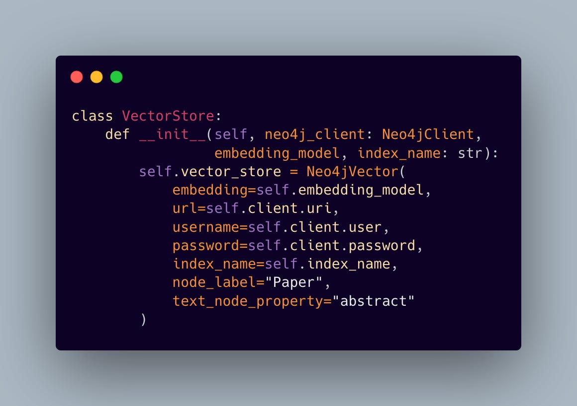 The final piece of our data infrastructure integrates Langchain’s Neo4jVector store, enabling semantic search capabilities alongside graph operations: