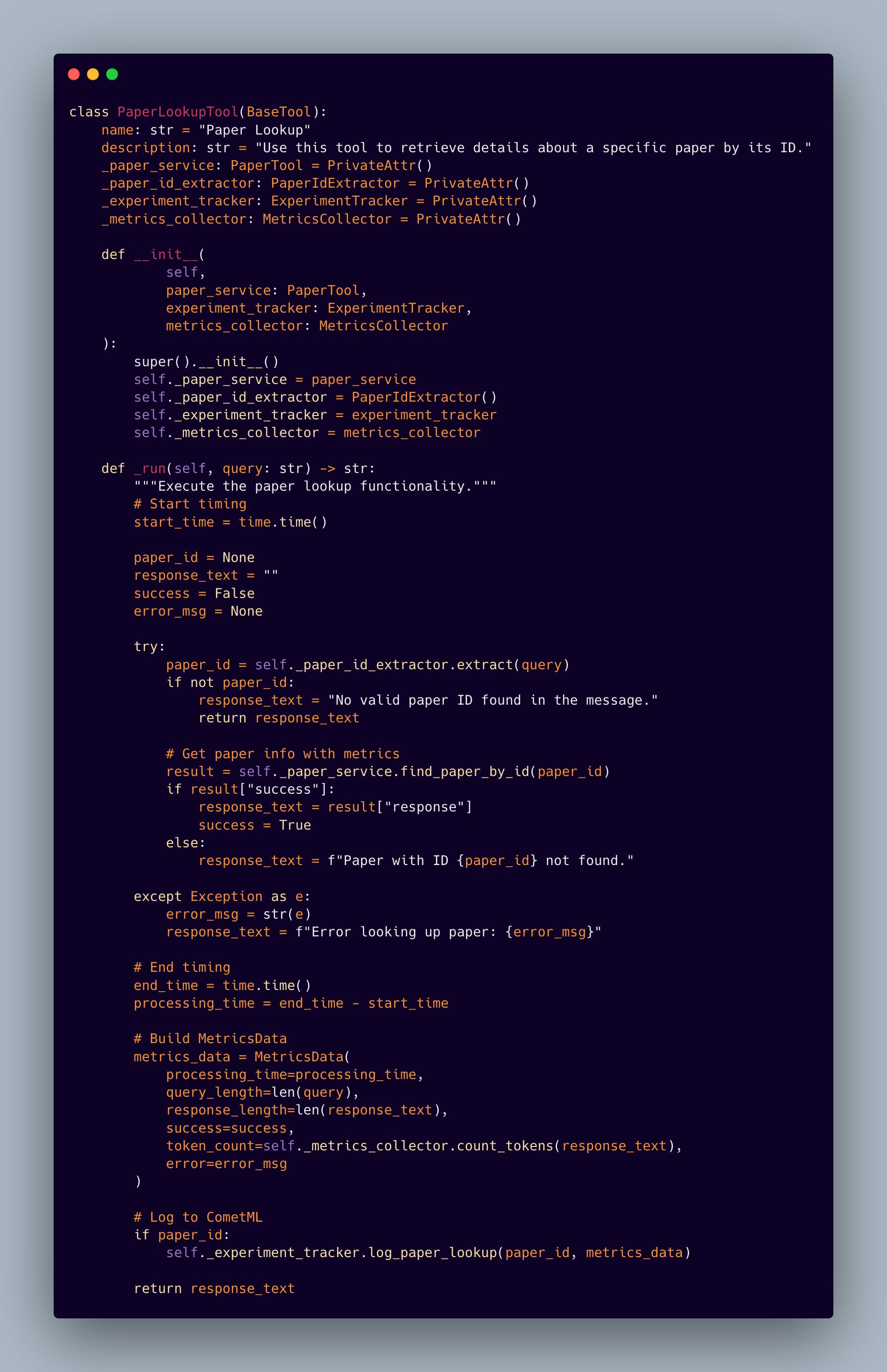 This tool abstraction enables autonomous agents to leverage our RAG and paper lookup tool system while maintaining clean separation of concerns. The implementation handles error cases gracefully while preserving the rich metadata needed for performance analysis.