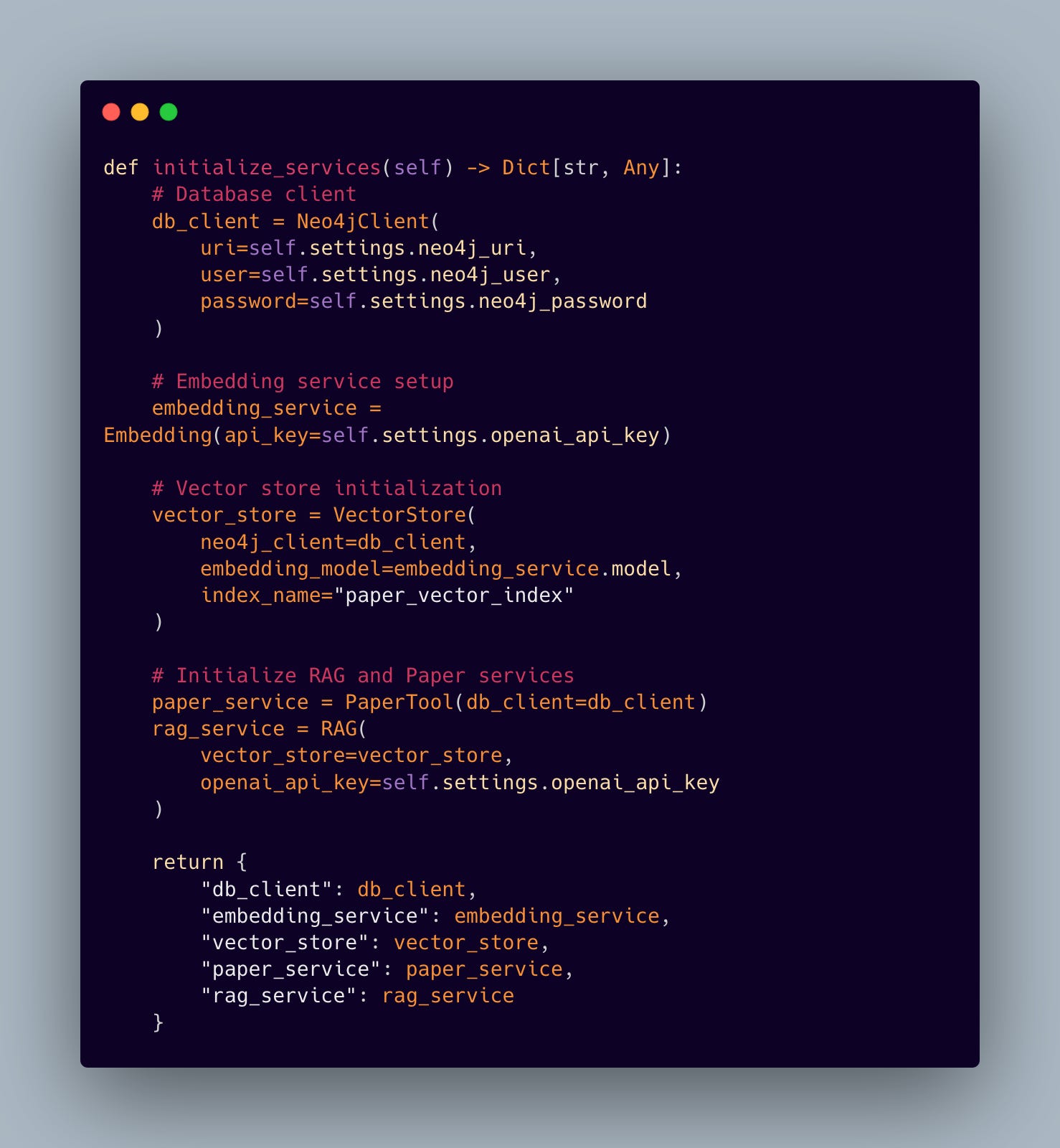 The service initialization layer demonstrates how we bring together our various components into a cohesive system: