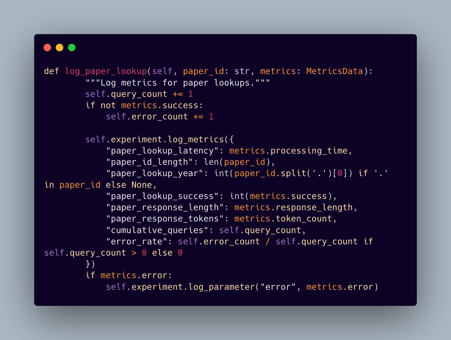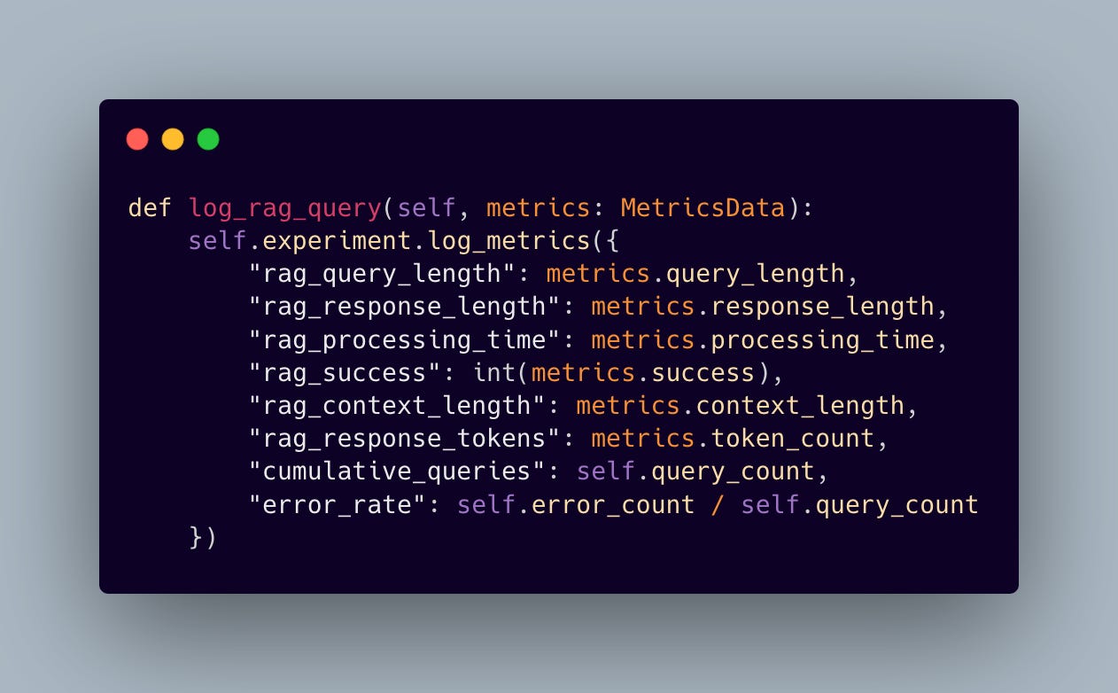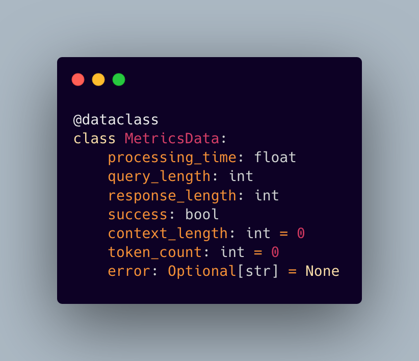 At the heart of our implementation lies a carefully crafted metrics collection system. Rather than simply throwing numbers into the void, we’ve designed a structured approach that captures the pulse of our RAG system:
