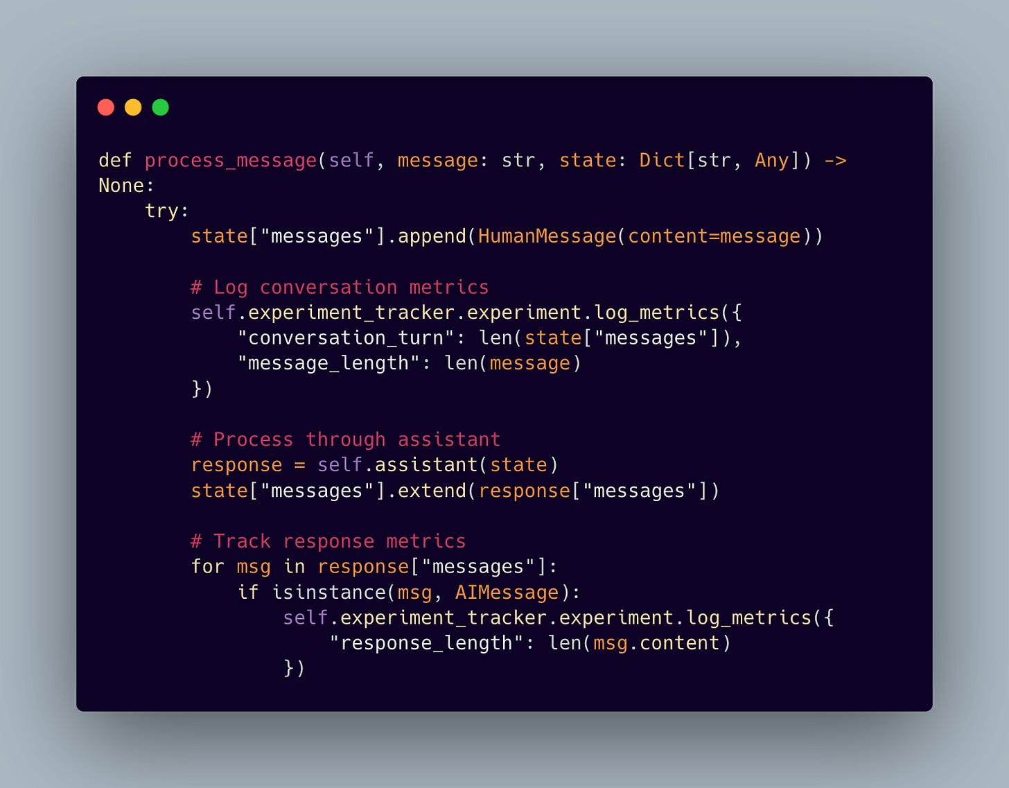 The Coordinator implements message processing that maintains conversation state while collecting valuable metrics: