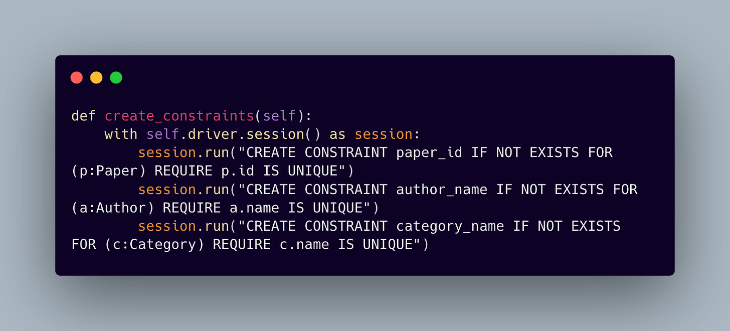 We chose Neo4j as our graph database for its robust support of complex academic relationships. The schema design reflects the natural structure of academic literature, where papers connect to authors and categories in a many-to-many relationship. To maintain data integrity, we enforce constraints across our node types: