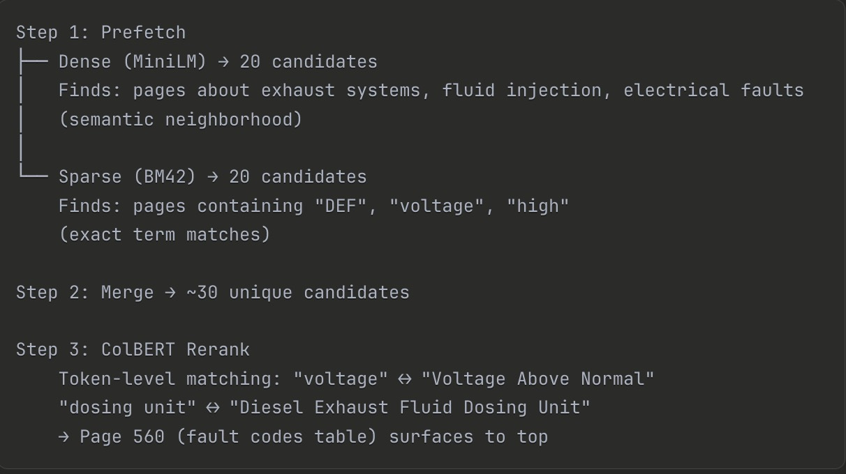 Dense found the right neighborhood. Sparse ensured exact terms weren’t missed. ColBERT picked the winner by matching at token granularity.
