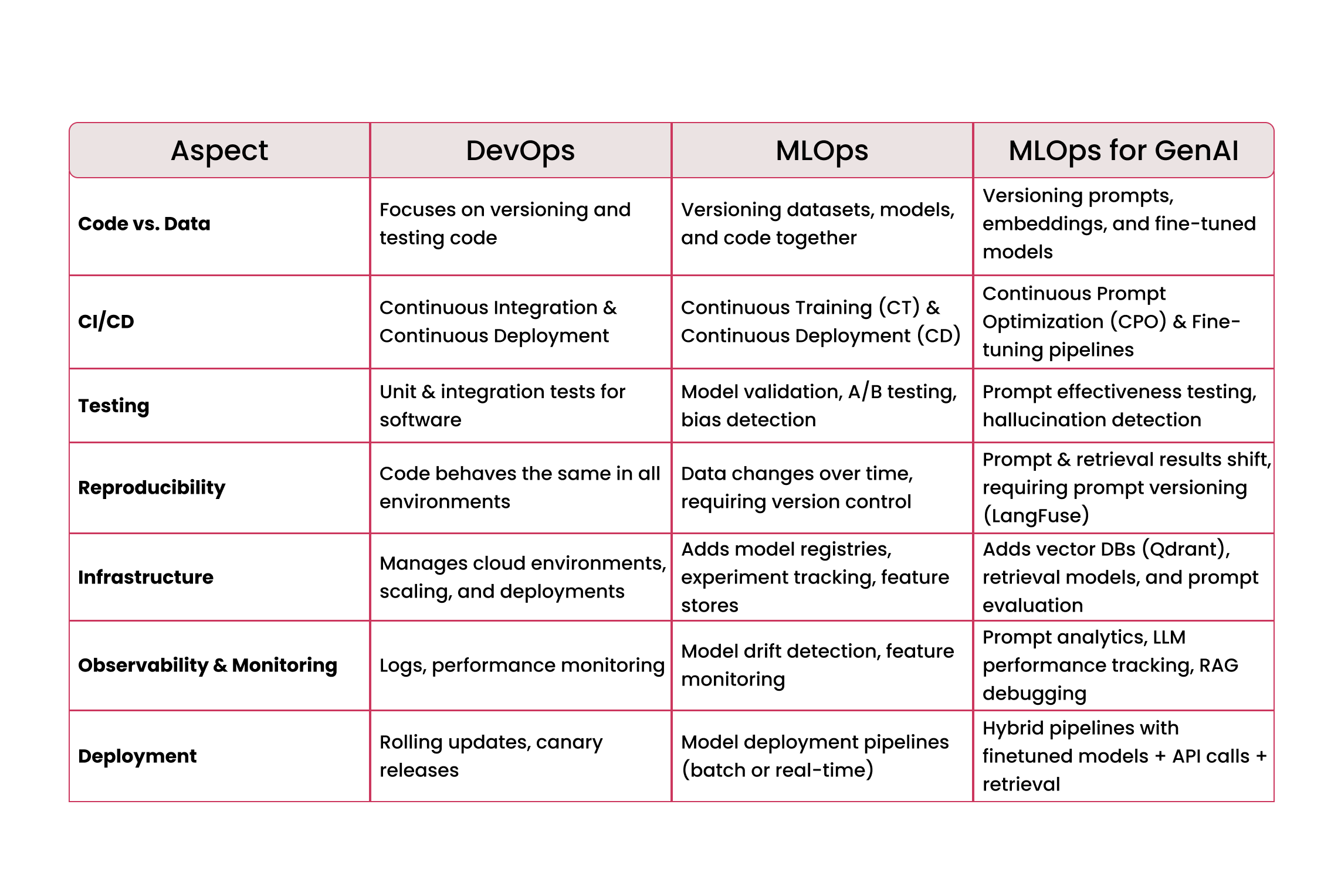 GenAI Needs MLOps to handle prompt versioning, model drift, and RAG complexities.
